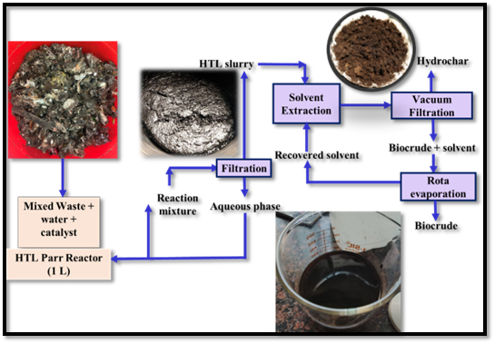Biocrude production via hydrothermal liquefaction (HTL) of mixed waste (plastic waste and food waste) resulted in a yield of approximately 10 wt.% under optimized reaction conditions of 310 °C temperature, 70 bar pressure, 20 minutes reaction time, 5 wt.% of CaCO3 catalyst, and a water-to-waste ratio of 5:1 within the reactor. This mixed waste stream serves as a promising and sustainable feedstock for the generation of value-added energy products. In addition to biocrude, hydrochar is obtained as a solid biofuel, along with non-condensable gases as by-products. Both biocrude and hydrochar have significant potential for applications in the energy sector.