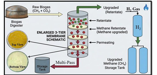 Biogas yield enhancement was achieved through membrane-based upgrading of raw biogas (primarily CH₄ and CO₂ along with other trace gases and impurities) using a multi-stage separation approach to improve methane concentration and overall fuel quality. The raw biogas was passed through a 3-tier membrane system, where CO₂ and other undesirable components selectively permeated as the rejected stream, while CH₄ was retained as the enriched gas fraction. The implementation of a multi-pass configuration significantly improved separation efficiency, leading to enhanced methane purity and increased effective biogas yield. The continuous removal of CO₂ and impurities reduced dilution effects and improved the calorific value of the final gas stream. The upgraded methane was subsequently collected and stored, with hydrogen (H₂) observed as a minor byproduct. Overall, the process results in a substantial increase in usable biogas output by enriching CH₄ content, thereby improving energy efficiency and suitability for practical applications.