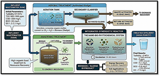 Wastewater treatment using a microbial enrichment approach integrated with nanofluid and plant-derived extract resulted in highly efficient pollutant removal under controlled conditions of near-neutral pH (≈6.5–7.5), ambient temperature (≈25–30 °C), and 24–48 hours incubation time. The optimized system, comprising activated sludge, nanofluid, and plant extract, demonstrated superior performance, achieving ~100% turbidity removal (from 8–9 NTU to ~0 NTU), >99% reduction in total dissolved solids (500–1500 ppm to ~5 ppm) and conductivity (1800–2200 µS/cm to ~7 µS/cm), and >99% removal of suspended solids (<30 mg/L to ~0.008 mg/L). Additionally, a significant improvement in dissolved oxygen was observed (from ~1.2–2.2 mg/L to ~7.9 mg/L), along with substantial reductions in organic load, with COD decreasing from <200 mg/L to ~5.1 mg/L (~97–98%) and BOD from <30 mg/L to ~0.8 mg/L (~95–97%). The synergistic interaction between microbial metabolism, nanoparticle-assisted adsorption, and phytochemical stabilization enhances pollutant degradation and water purification efficiency. Along with treated water, biomass (sludge) is generated as a byproduct, which can be further utilized for energy recovery or soil applications. Overall, this integrated nano–bio–phytochemical system presents a sustainable and effective approach for advanced wastewater treatment and water reuse.