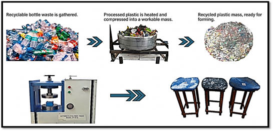 Solid plastic waste was effectively converted into value-added utility products such as plastic mats, tables, stools, and other molded items through controlled thermal and mechanical processing techniques. The collected plastic waste, primarily consisting of low-value and non-recyclable fractions, was subjected to segregation, cleaning, and size reduction, followed by heating under optimized temperature conditions to achieve softening and moldability. The processed material was then shaped using casting and compression techniques to produce durable and functional products. This approach not only reduces plastic waste accumulation but also transforms it into economically useful materials with practical applications. Additionally, the developed products exhibit good mechanical strength, durability, and resistance to environmental degradation, making them suitable for long-term use. Overall, this method provides a sustainable pathway for plastic waste management by converting waste into valuable utility items while minimizing environmental impact.