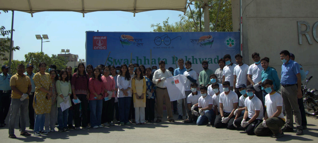 A multi-faceted cleanliness drive supported by ONGC, including cleaning campaigns, awareness workshops, competitions, and sanitary pad distribution in nearby villages.