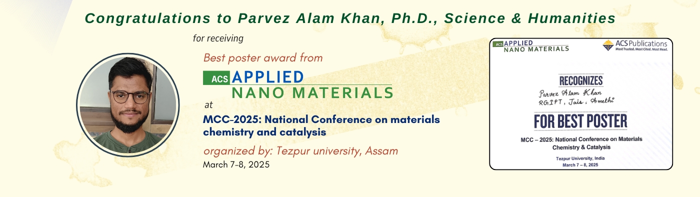 • Mr Parvez Alam Khan, PhD student, received the Best Poster Award from ACS Applied Nano Materials at MCC-2025: National Conference on Materials Chemistry and Catalysis, organized by Tezpur University, Assam, on March 7–8, 2025. view