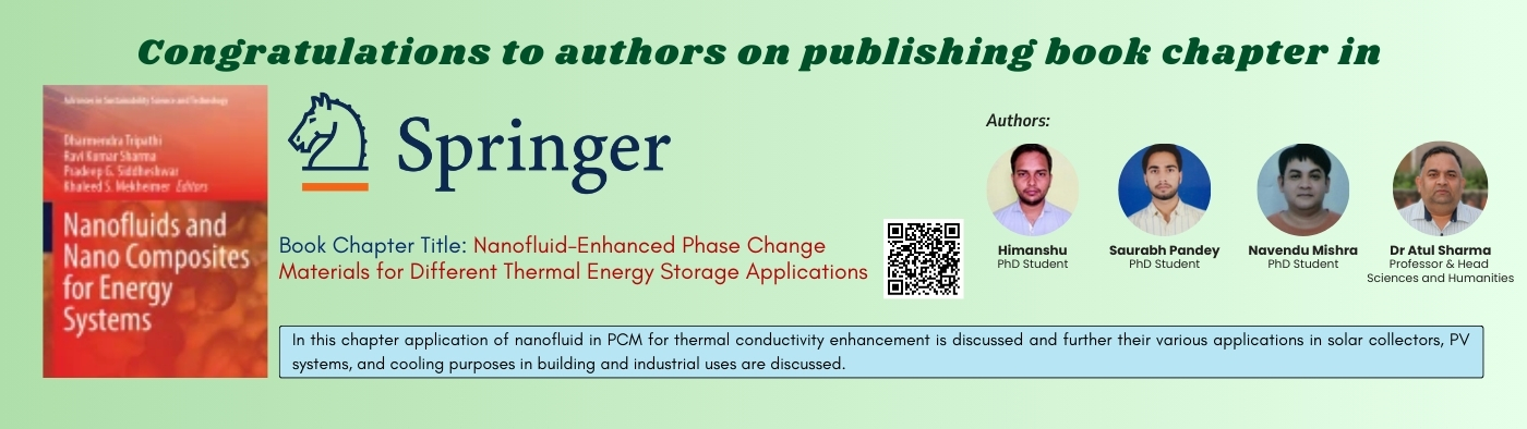 • Congratulations to Mr Himanshu (PhD), Mr Saurabh Pandey (PhD), Mr Navendu Mishra (PhD), and Professor Atul Sharma (Professor and Head, Energy & Human Sciences) on publishing a book chapter with Springer. view