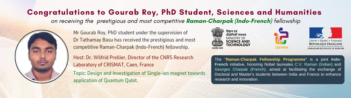 • Gaurab Roy, PhD student, received the prestigious and highly competitive Raman–Charpak (Indo–French) Fellowship. view