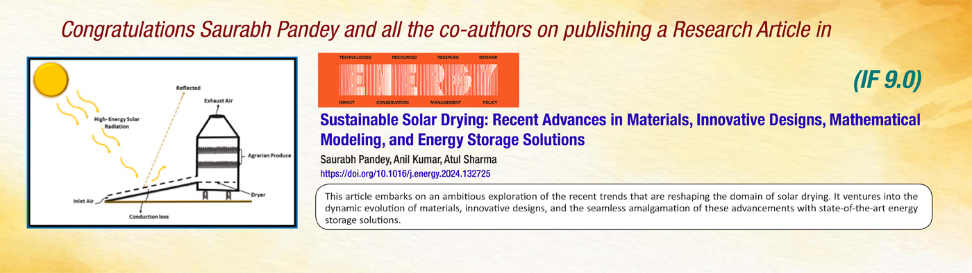 • Congratulations to Mr Saurabh Pandey (PhD), Mr Anil Kumar (PhD), Professor Atul Sharma (Professor and Head, Energy & Human Sciences), and all co-authors on publishing a research article in Energy (Impact Factor: 9.0). view