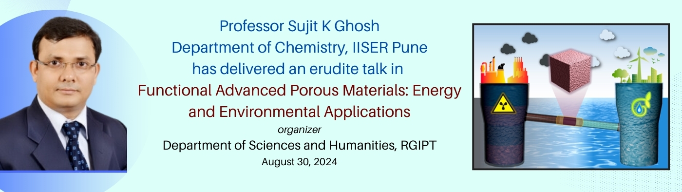 Professor Sujit K Ghosh, Deprtment of Chemistry, IISER Pune has delivered an erudite talk in Functional Advanced Porous Materials: Energy and Environmental Applications, August 30, 2024;