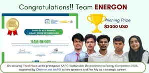 - Congratulations!! Team ENERGON for securing Third Place at the prestigious AAPG Sustainable Development in Energy Competition 2025, supported by Chevron and AAPG as key sponsors and Pro Ally as a strategic partner. view