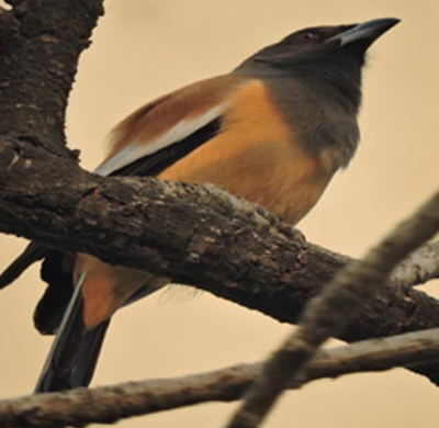 A long-tailed chestnut-brown bird about the size of myna with sooty head and neck is also a permanent resident especially in residential area of RGIPT campus. The broad black tips of the longest tail feathers and the greyish-white wing-coverts are particularly conspicuous on the wing. The flight is undulating—a swift noisy flapping, followed by a short glide on outspread wings and tail. It is a very beautiful bird and has wide repertoire of quite melodious calls. It is of a social disposition going about in pairs or family parties which keep up a loud grating conversation. The birds are omnivorous. Their staple diet is insects, caterpillars, lizards, baby rats besides fruits and berries